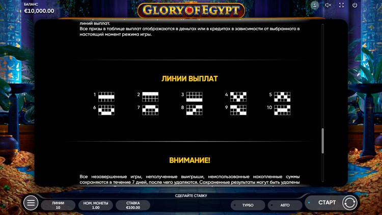 Таблица выплат Glory of Egypt