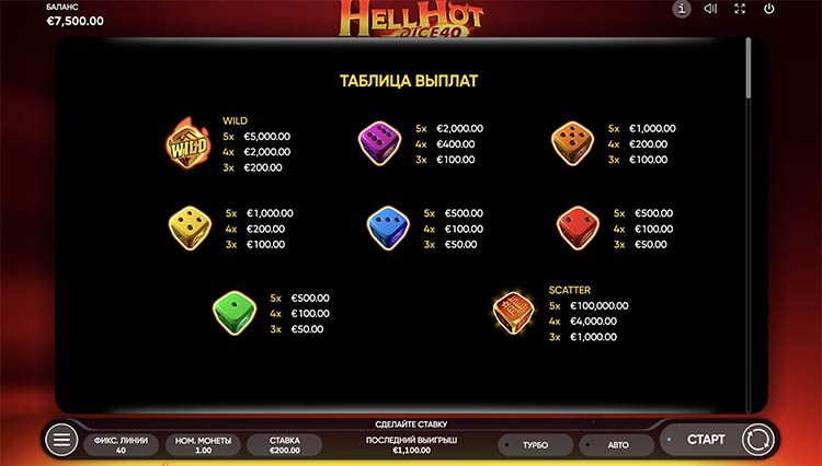 | Огненный кубик (Wild) | 200 | 2000 | 5000 |