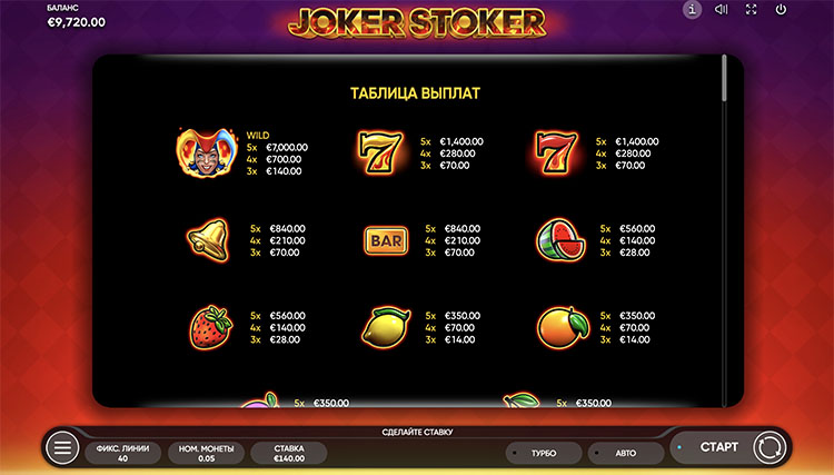 | Джокер (Wild) | 140 | 700 | 7000 |