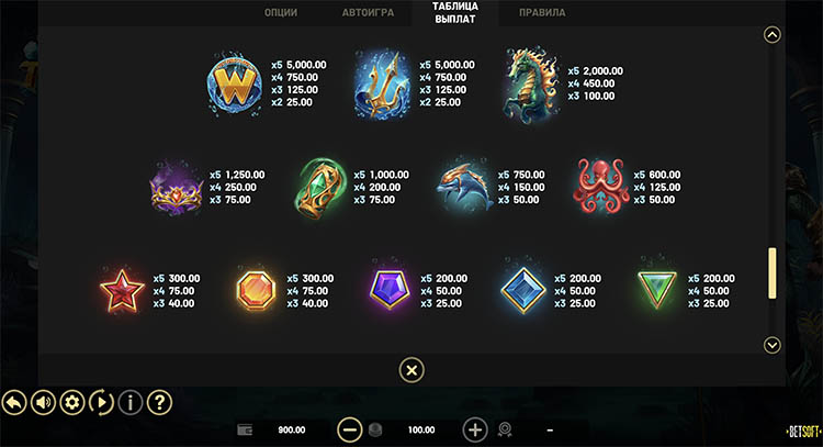 | Трезубец, Wild | 25 | 125 | 750 | 5000 |