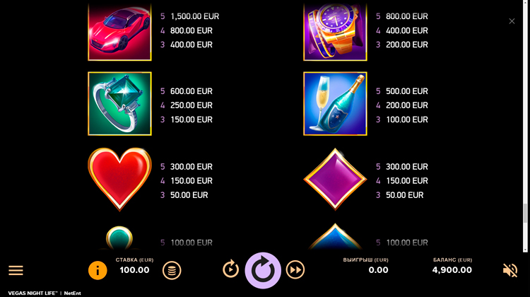 Таблица выплат Vegas Night Life