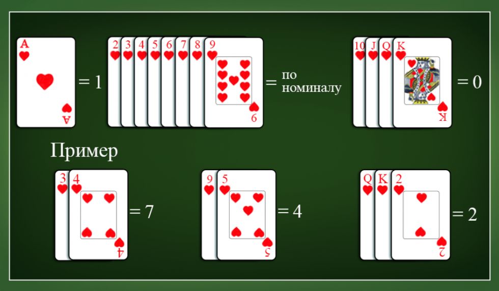 Очки каждой руки считаются следующим образом: если сумма очков двух карт больше 9, то десятки отбрасываются. Например, если у вас есть 7 и 6, что в сумме дает 13, то ваша рука считается как 3 очка.