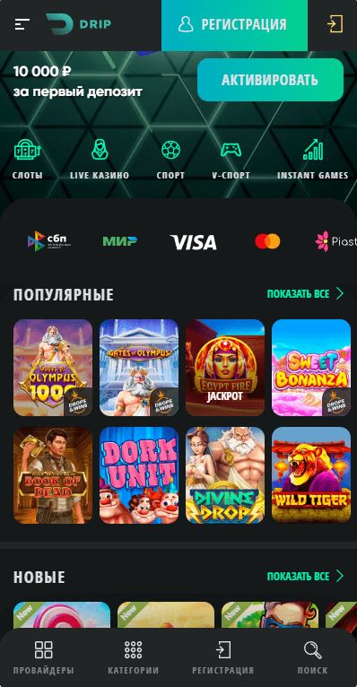 Официальный сайт Drip Casino отличается стильным и современным дизайном, который обеспечивает комфортное и интуитивно понятное использование. Главные элементы навигации легко доступны, что позволяет быстро найти нужные разделы и игры. Основные разделы сайта включают: